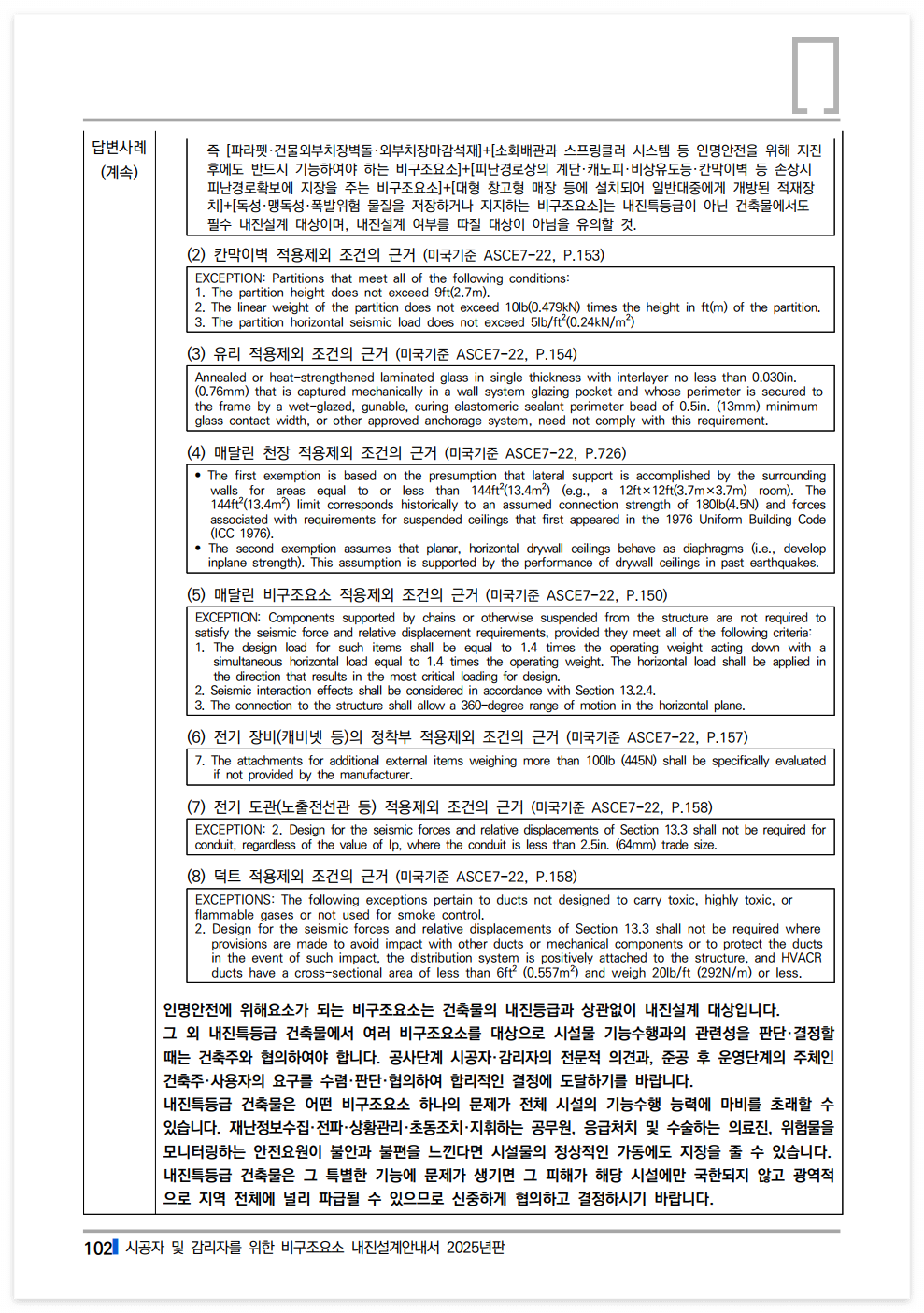 그 외에 내진특등급 건축물에서 여러 비구조요소를 대상으로 시설물 기능수행과의 관련성을 판단·결정할 때는 건축주와 협의하여야 합니다. 공사단계 시공자·감리자의 전문적 의견과, 준공 후 운영단계의 주체인 건축주·사용자의 요구를 수렴·판단·협의하여 합리적인 결정에 도달하기를 바랍니다.